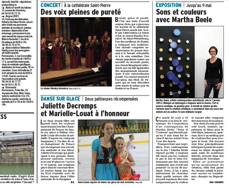 EXPOSITION COLLECTIVE : "8 FEMMES PLASTICIENNES" Du 9 au 21 mai : 14 h à 18 h / Week-ends et jour férié : 10 h à 19 h Prieuré de Sévrier (à droite de l'église, n° 144) Sculpter, découper, coller, peindre, assembler... elles s'expriment de multiples façons...