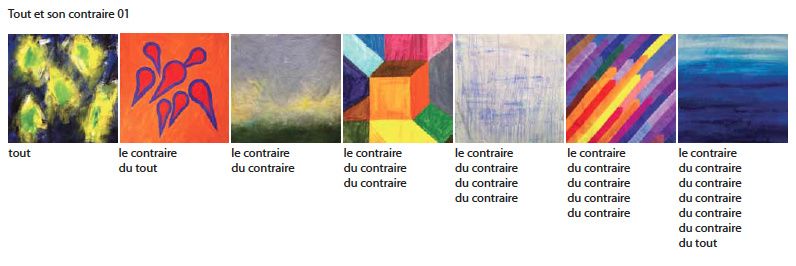 Dans cette série, une (presque) même phrase est peinte plusieurs fois, toujours dans la même forme d’organisation, mais avec des changements de couleurs et un sens final différent à chaque fois. La phrase en question est proposée à différentes personnes de l’atelier qui ont choisi chacune une façon différente et personnelle de la terminer.